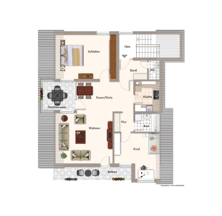 Beim Betreten der Wohnung erwartet Sie ein geräumiger Eingangsbereich mit Garderobe, und Zugang zum WC. Über die Diele gelangen Sie in den Essbereich mit Zugang zur Dachterrasse. Dieser Bereich ist mit der angrenzenden Küche verbunden. Das Wohnzimmer zeichnet sich durch hohe Decken und den direkten Zugang zum Balkon aus, der einen schönen Ausblick bietet. Neben einem großzügigen Schlafzimmer gibt es ein weiteres Zimmer, das flexibel als Kinderzimmer, Gästezimmer oder Homeoffice genutzt werden kann. Das Badezimmer ist funktional gestaltet.