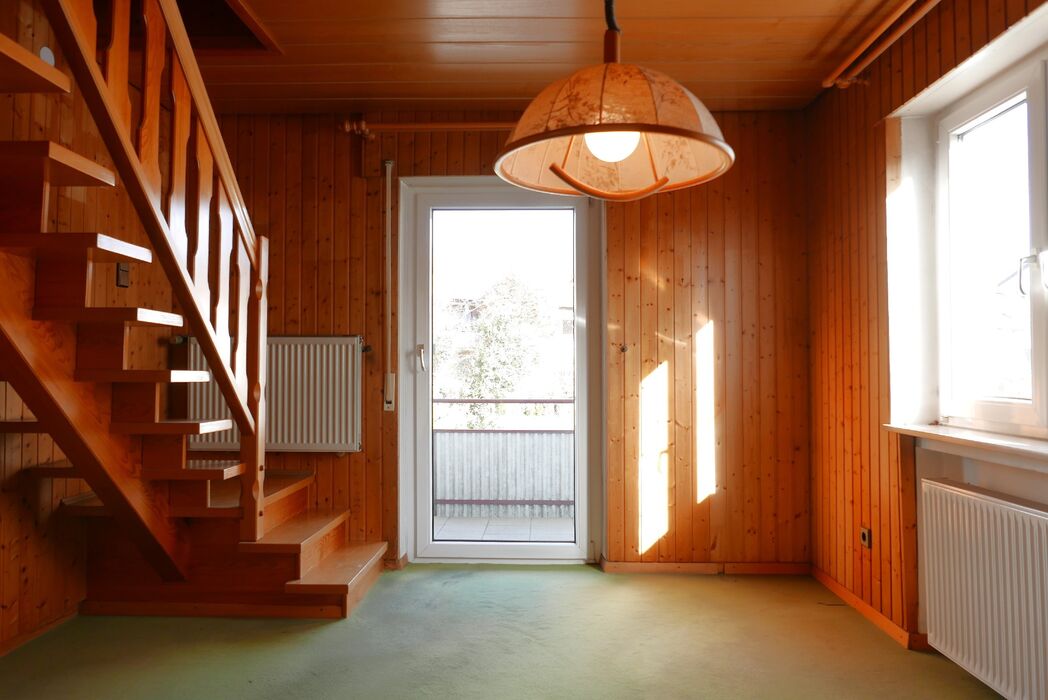Über den Eingang im Obergeschoss eines 4-Familienhauses gelangen Sie in den zentralen Flur. In dieser Etage erwartet Sie ein WC, ein Tageslichtbad mit Wanne, ein Schlafzimmer sowie das freundliche Wohnzimmer mit Balkon. Gegenüber liegt das Esszimmer mit Zugang zum zweiten Balkon und Treppe ins Dachgeschoss.