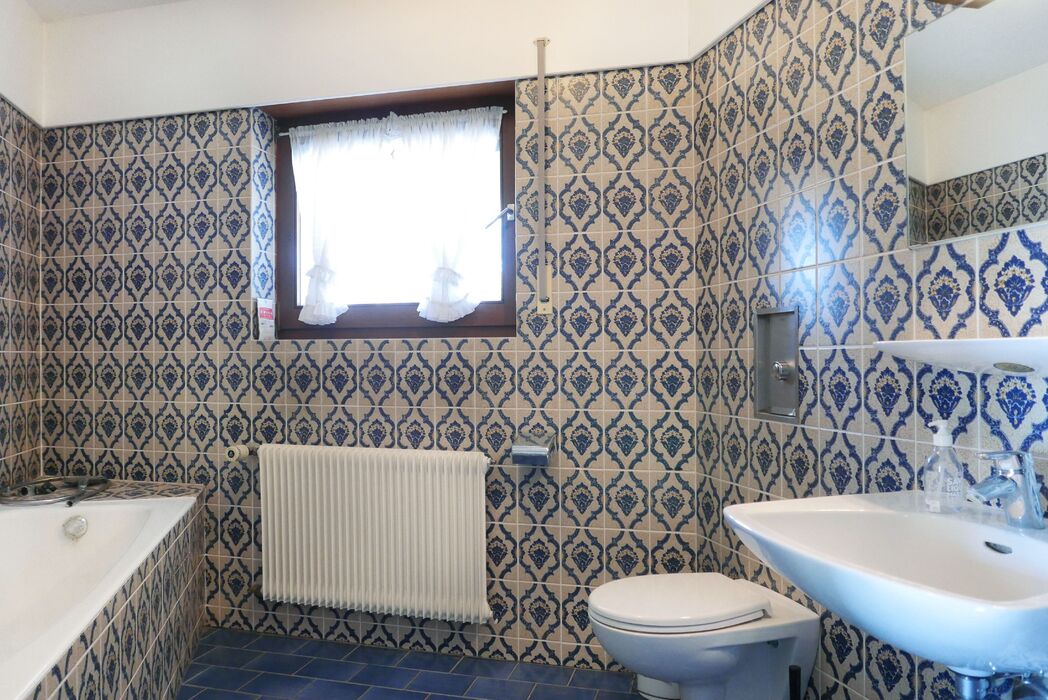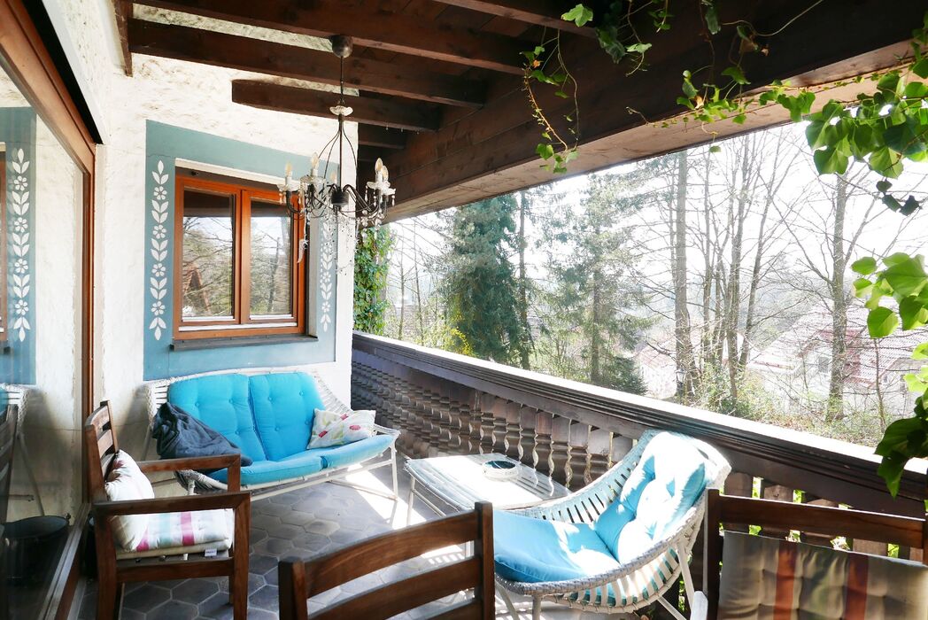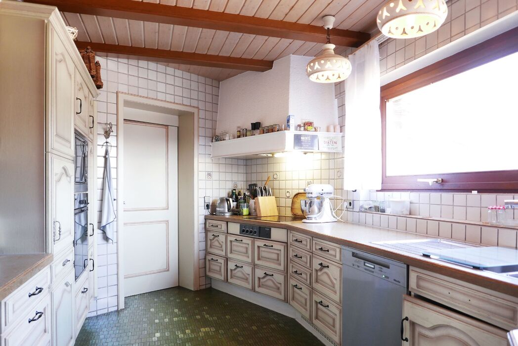 Angrenzend befinden sich das Esszimmer, eine gemütliche Erkerstube sowie die Küche mit separatem Hauswirtschaftsraum. Die überdachte Terrasse ist vom Wohnbereich aus direkt erreichbar und lädt zum Verweilen im Freien ein.