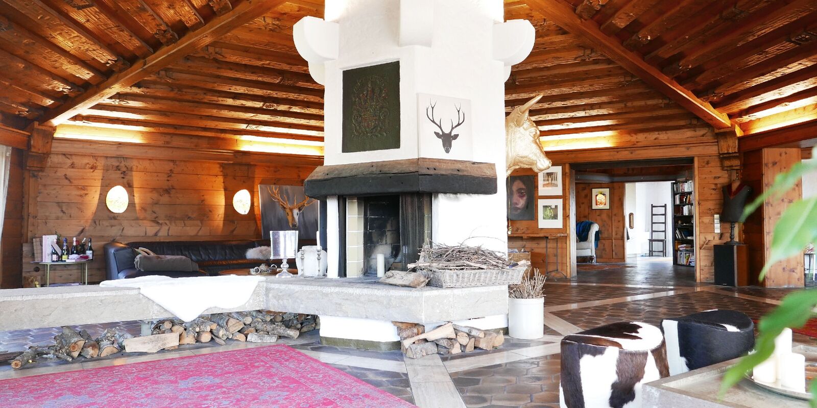 Der Zugang zum Haus erfolgt über einen einladenden Windfang, der in eine stilvolle Eingangshalle übergeht. Von hier aus öffnet sich das Herzstück der Villa: ein beeindruckender, weitläufiger Wohnbereich mit außergewöhnlicher Raumhöhe, zahlreichen Fensterflächen und einem zentral platzierten offenen Kamin, der dem Raum eine behagliche und zugleich repräsentative Atmosphäre verleiht.