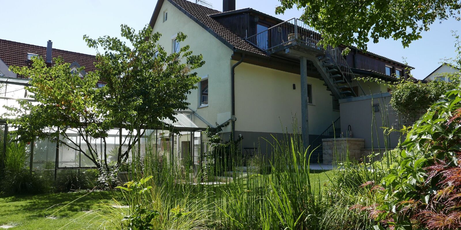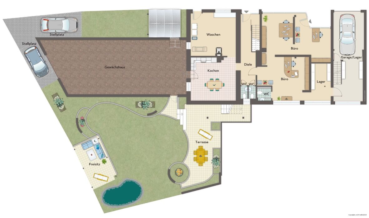 Im Erdgeschoss befindet sich ein geräumiges Büro mit angrenzender Lagerfläche, ideal für Selbstständige oder Homeoffice-Nutzer. Ergänzt wird diese Ebene durch einen Hauswirtschaftsraum, einen Hobbyraum, eine Garage sowie den direkten Zugang zum großen Gewächshaus. Eine gemütliche Terrasse lädt zum Entspannen ein, während der liebevoll angelegte Garten mit Teich zusätzlichen Erholungswert bietet.
