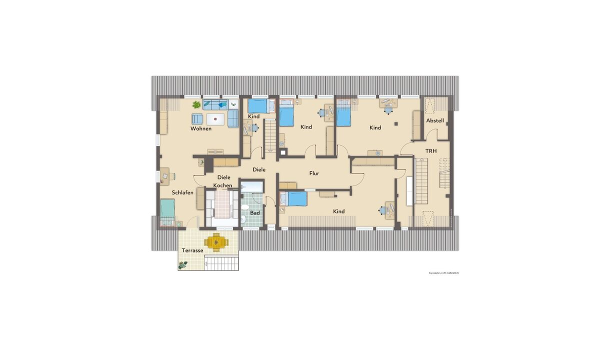Über das Treppenhaus gelangen Sie in das Dachgeschoss, das mit einem weiteren Bad, vier weiteren Zimmern sowie praktischen Abstellflächen überzeugt. Eine zweite Terrasse mit direktem Treppenabgang in den Garten erweitert den Wohnraum nach außen. Zusätzlich besteht Zugang zu einer kleinen Werkstatt, ideal für handwerkliche Hobbys oder kreative Projekte.