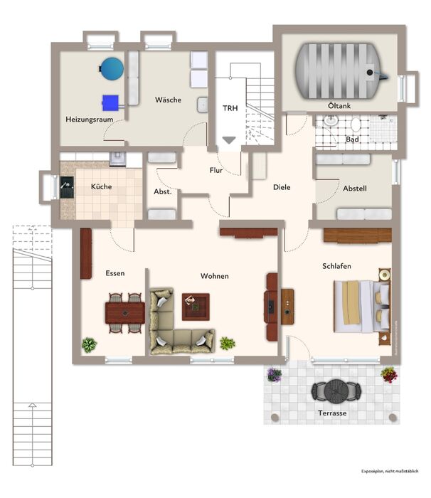 Im Gartengeschoss befindet sich eine gemütliche 2,5-Zimmerwohnung mit einem Essbereich und einem geräumigen Wohnzimmer, das direkt an die Küche angrenzt. Das Schlafzimmer bietet Zugang zur Terrasse. Diese lädt zum Verweilen im Grünen ein. Ein Bad mit Dusche, Waschbecken und WC, ein Abstellraum sowie eine Diele. Zusätzlich stehen im Gartengeschoss ein gemeinschaftlicher Waschmaschinenraum sowie der Heizungsraum und das Öllager zur Verfügung.