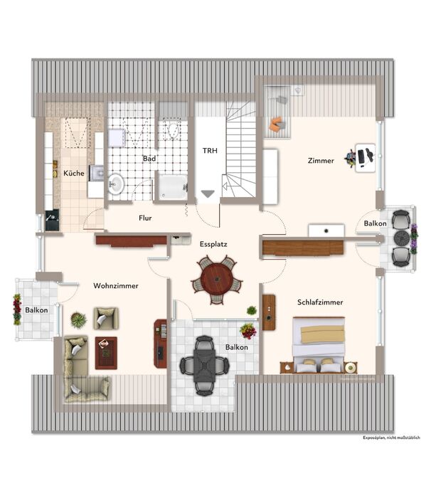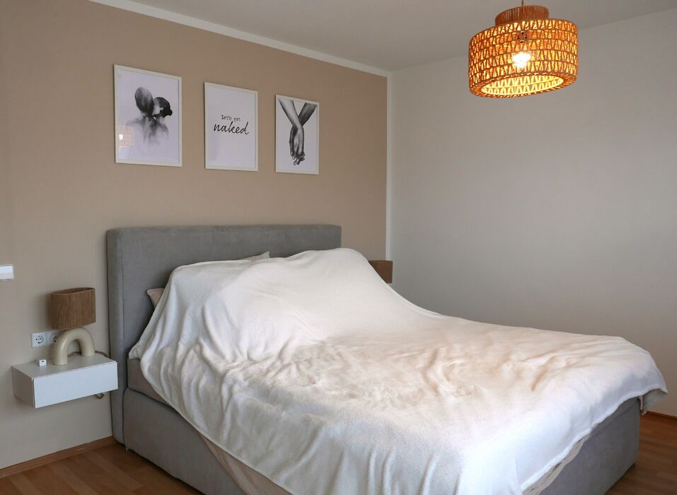 Im Dachgeschoss befindet sich eine weitere großzügige Wohnung. Das Wohnzimmer bietet Zugang zu einem der drei Balkone und grenzt an die Küche. Der Essbereich ist räumlich abgetrennt und verfügt über einen Zugang zum großen Hauptbalkon mit herrlicher Aussicht ideal für entspannte Mahlzeiten und Sommertage. Zwei helle Schlafzimmer mit jeweils eigenem Balkonzugang bieten viel Privatsphäre. Abgerundet wird die Einheit durch ein Badezimmer mit Duschkabine, WC, Waschbecken und Anschluss für eine Waschmaschine.