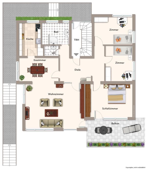Die Erdgeschosswohnung empfängt mit einer geräumigen Diele und überzeugt durch einen hellen Wohn- und Essbereich mit Zugang zur Küche. Das Tageslichtbad ist mit Dusche, Badewanne und einem großen Waschbecken ausgestattet; ein separates WC sorgt für zusätzlichen Komfort. Das Schlafzimmer mit Balkonzugang sowie zwei weitere Zimmer bieten Platz für Kinder, Gäste oder Home Office. Diese Einheit steht aktuell leer.