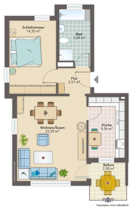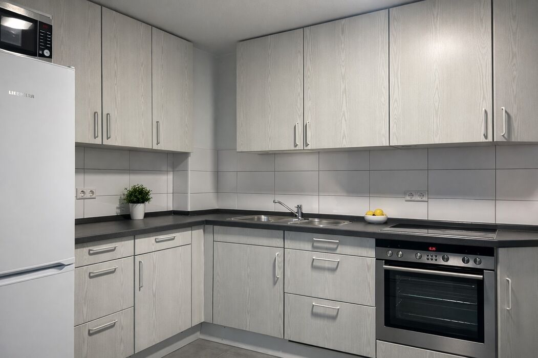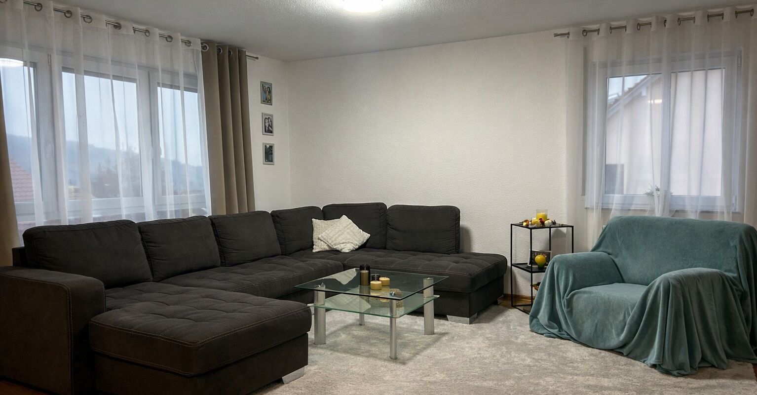 Auf der linken Seite öffnet sich der großzügige Wohn- und Essbereich mit offener Küche. Große Fenster sorgen für viel Tageslicht und eine freundliche Atmosphäre. Vom Wohnbereich aus haben Sie direkten Zugang zum Balkon, der zum Verweilen im Freien einlädt.