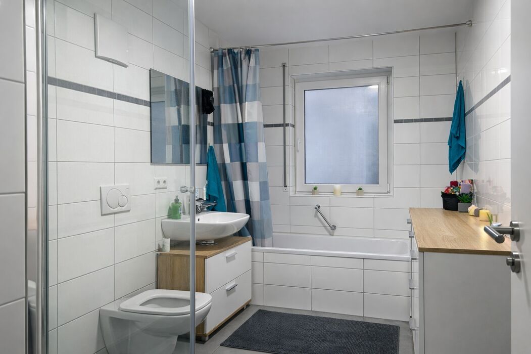 Rechter Hand befindet sich das großzügige Tageslichtbad, ausgestattet mit Badewanne, Dusche, WC und Waschbecken.