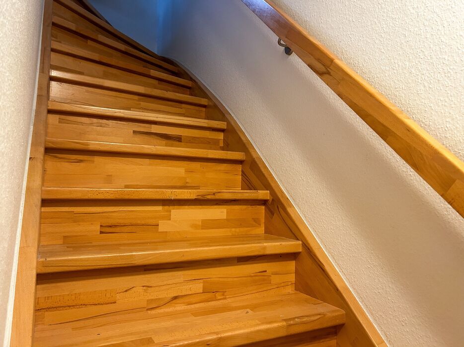Über eine Treppe erreichen Sie das untere Geschoss der Maisonettewohnung. Hier befinden sich ein großes Schlafzimmer, ein praktischer Abstellraum sowie der Zugang zur Terrasse und zum kleinen Garten.