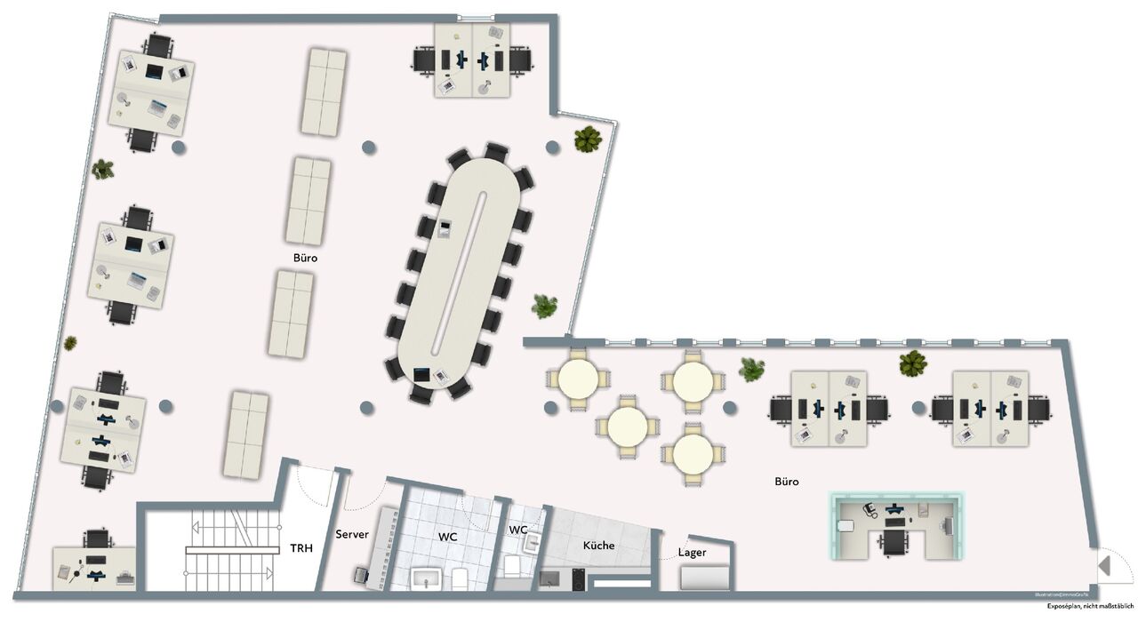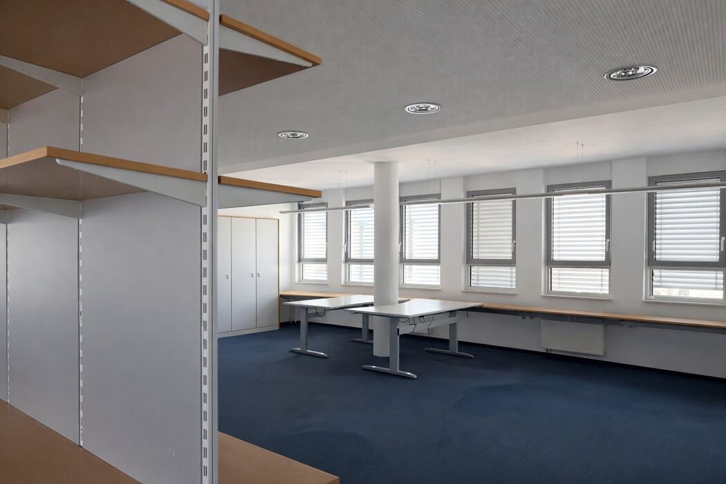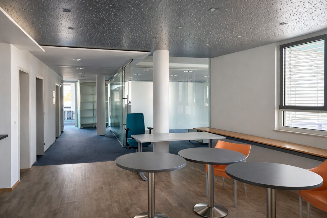 Dank offener Gestaltung, abgehängter Decken und Doppelboden ist eine flexible Raumaufteilung möglich.