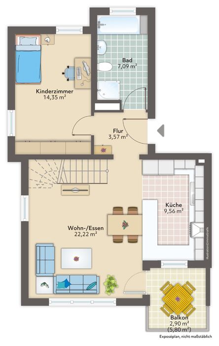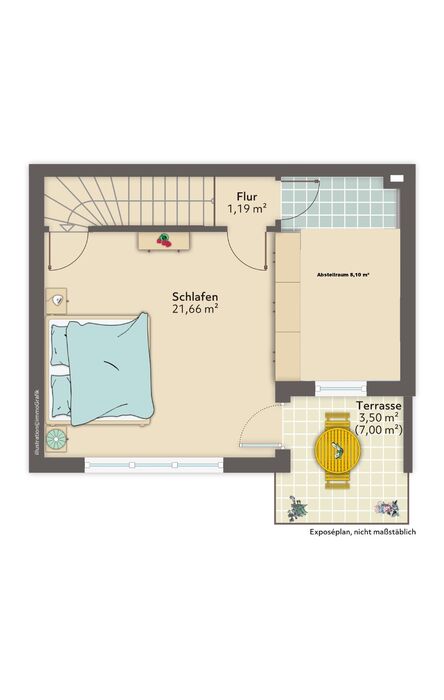 Über eine Treppe erreichen Sie das untere Geschoss der Maisonettewohnung. Hier befinden sich ein großes Schlafzimmer, ein praktischer Abstellraum sowie der Zugang zur Terrasse und zum kleinen Garten.