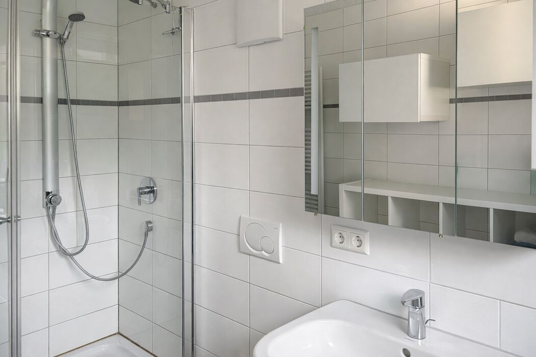 Rechts befindet sich das helle Tageslichtbad, ausgestattet mit Dusche, Badewanne, WC und Waschbecken - ideal für Komfort und Funktionalität im Alltag.