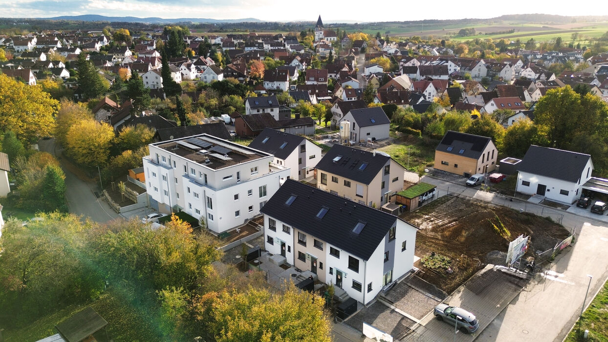 sowie sechs Doppelhaushälften und drei Reihenhäuser zum schlüsselfertigen Bezug.
