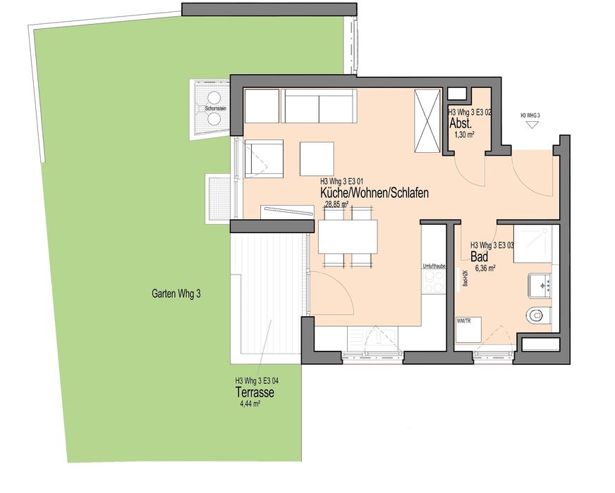 Das 1-Zimmer-Apartment ist mit einer offenen Küche ausgestattet und verfügt über eine sichtgeschützte Terrasse mit Gartenanteil. Das Tageslichtbad ist mit Dusche und WC ausgetstattet. Zudem verfügt die Wohnung über einen kleinen Abstellraum in der Wohnung.