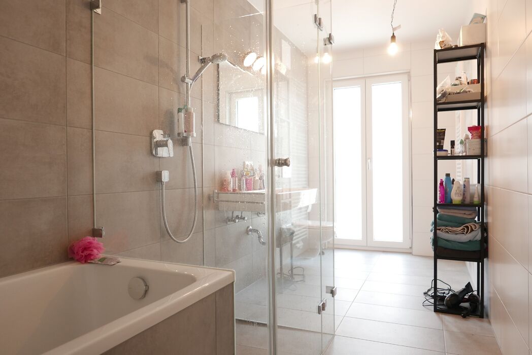 Das Tageslichtbad bietet eine bodengleiche Dusche, WC, eine Badewanne und ein Waschbecken.